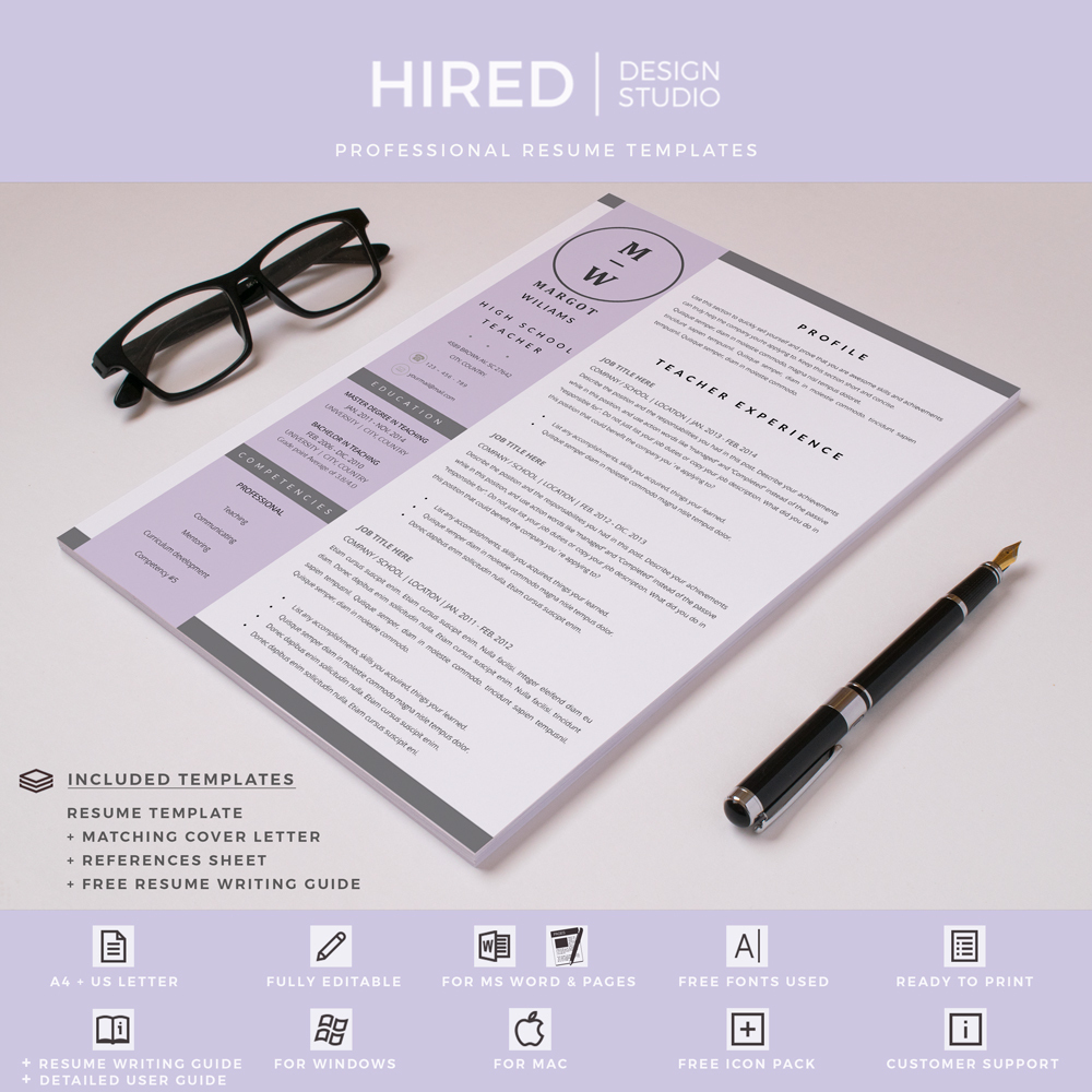 R04 - MARGOT WILLIAMS | Teacher Resume Template; CV Template for Pages & MS Word | Resume for Teachers + Matching Cover Letter + References + icons + Resume Writing guide